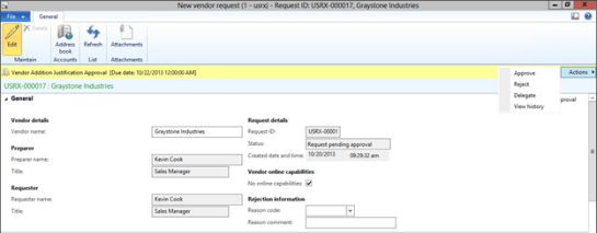 - You are able to update any of the information associated with the New Vendor Request, and you can approve it just by clicking on the Actions button in the workflow toolbar, and selecting the Approve option.