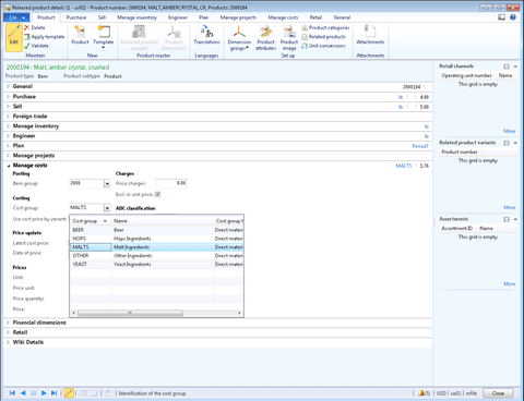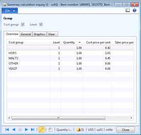 Now, when you re-run the cost roll up for your BOM/Formula, if you click on the Cost rollup by cost group menu item within the Item price maintenance form, you will see a breakdown of your costs by cost group.
