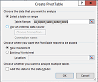 3. Excel will ask us where we should grab the data from and also where we want to put the Pivot Table results. Use the defaults, and just click on the OK button to continue.