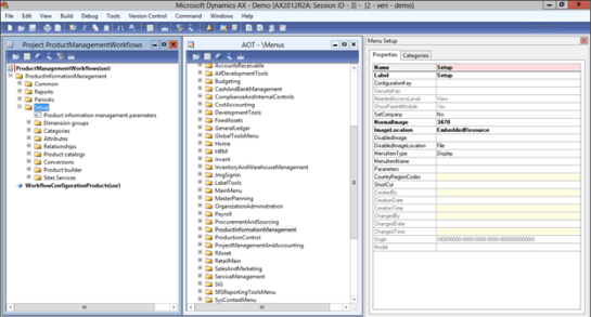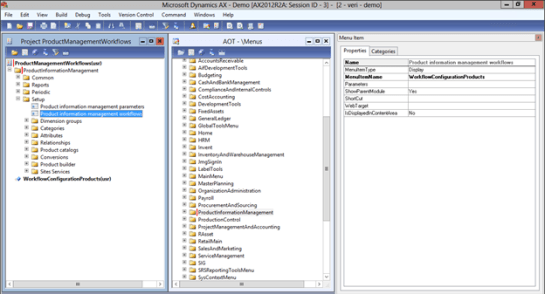 - Within the AOT tree, open up the Menus group and find the ProductInformationManagement menu.