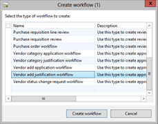 - When the procurement workflow template selection dialog box is displayed, select the Vendor add justification workflow template and click the Create workflow button to create the workflow shell.