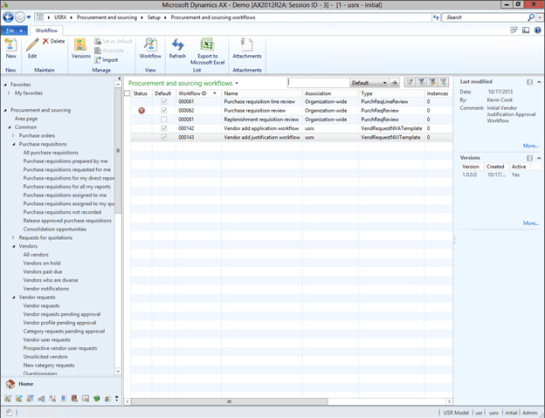 - When you return to the Procurement and sourcing workflows form, double-click on the Vendor add justification workflow workflow to open up the designer.