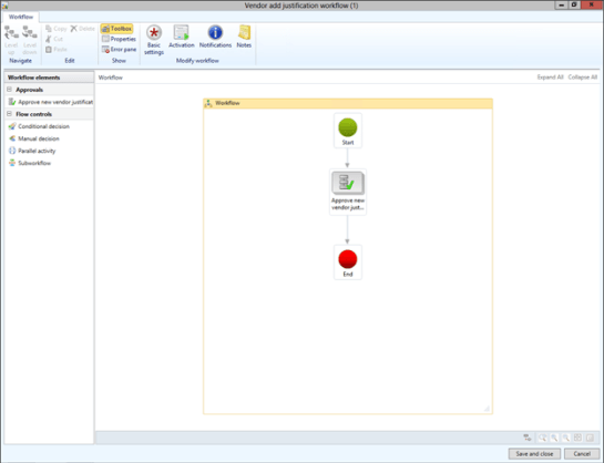 - When the workflow designer is displayed, create a simple flow that just has the Approve new vendor justification step and then click on the Save and close button to save and activate the workflow.