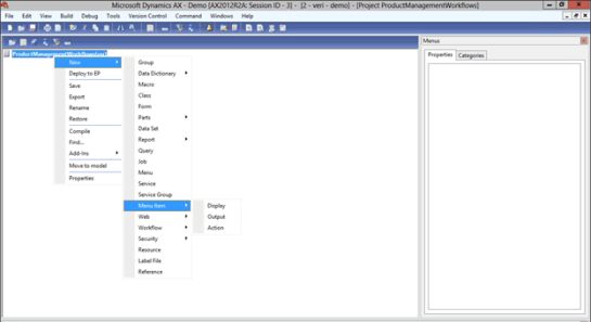 - From within the workflow development project, right-mouse-click on the parent folder, and from the New menu, select Menu Item and then Display to create a new display menu item.