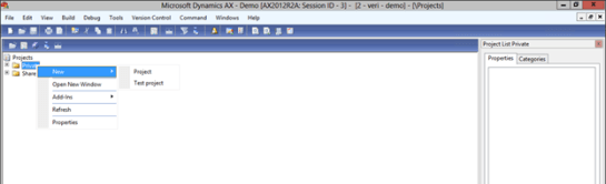 - Then the projects menu is displayed, right-mouse-click on the Private folder, and select the Project option from the New submenu.