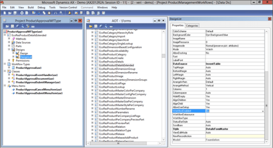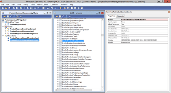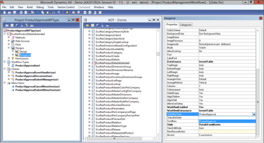 - Open up the AOT workspace so that you have both the ProductApprovalWFType Project and the AOT tree displayed. Within the AOT tree, open up the Forms group within the Data Dictionary and find the EcoResProductDetailsExtended form.