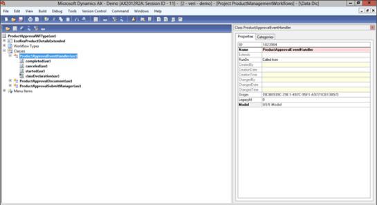 - Open up the ProductApprovalWFType project and open the Classes group select the ProductApprovalEventHandler class.