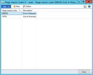 - When the Service reason code maintenance form is displayed, click on the New button in the menu bar to create the initial stage.