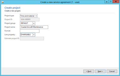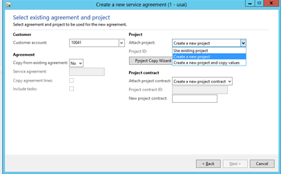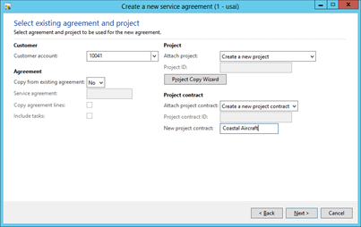 option. - Within the Project contract group, enter a description of the Service Agreement into the New project contract field.