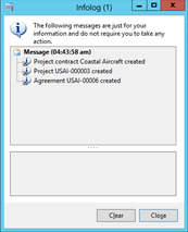 - You should receive an Infolog box showing that the Service Agreement has been created.