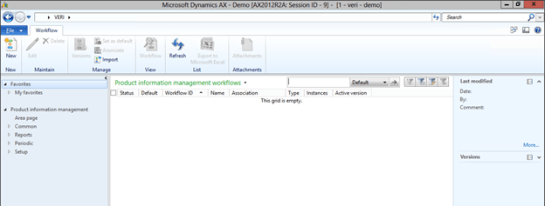 - From the Product information management area page, select the Product information management workflows menu item that we added in the previous steps.
