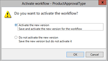- To finish the process, activate the workflow by selecting the Activate the new version radio button, and then click the OK button.