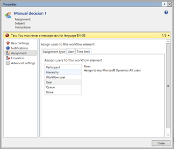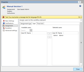 - Then in the Manual decision step assign a Name, Work item subject and some Work item instructions.