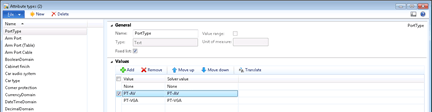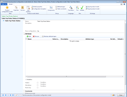 - The first step is to create any new types of attributes that you may be using in this model. To do this, open the Product configuration model maintenance form and expand the Attributes panel. From the Attributes menu bar, click on the Maintain attribute types menu button.