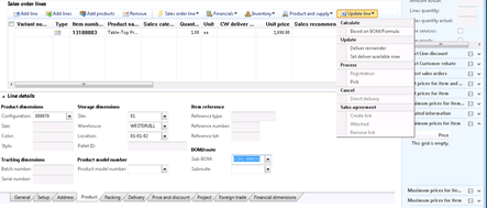 Additionally, from the Update line drop down menu in the Sales order lines panel, select the (Calculate) Based on BOM/Formula menu item.