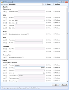 - Then configure any of the BOM line fields that you want to use. In this example we set the Calculation, Quantity, and Unit fields.