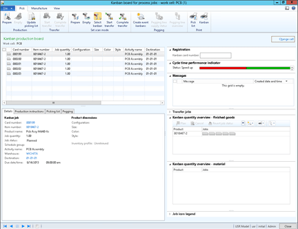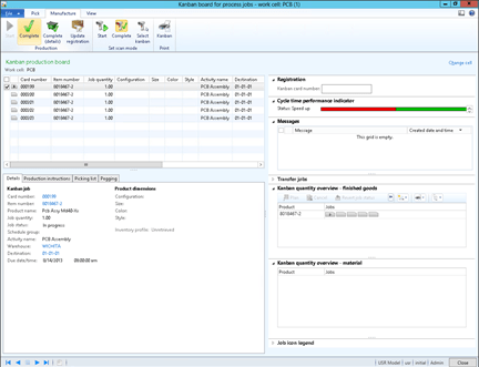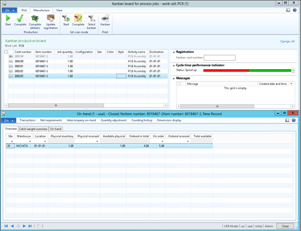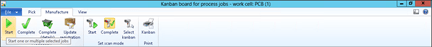 - To start a job, just select the Kanban record, and click the Start button in the Production group of the Manufacture ribbon bar.