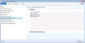 - From the Organization hierarchies form you will be able o see the retail hierarchies that are defined. For each of these we will probably want to add our new Store. To do this, select the hierarchy that you want to maintain, and click on the View button in the menu bar.