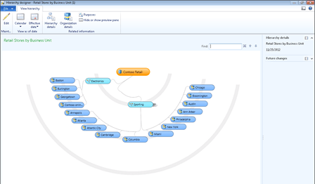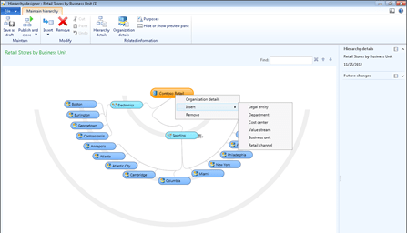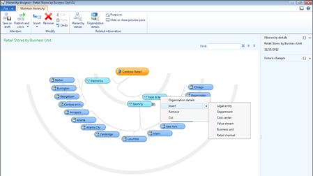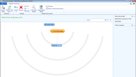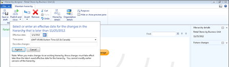 - To activate the hierarchy, select the Publish and close menu button from the Maintain group on the Maintain hierarchy ribbon bar, specify an activation date for the hierarchy, and then click Publish.